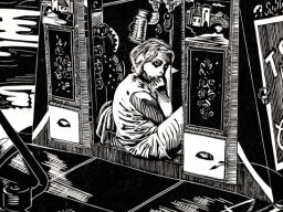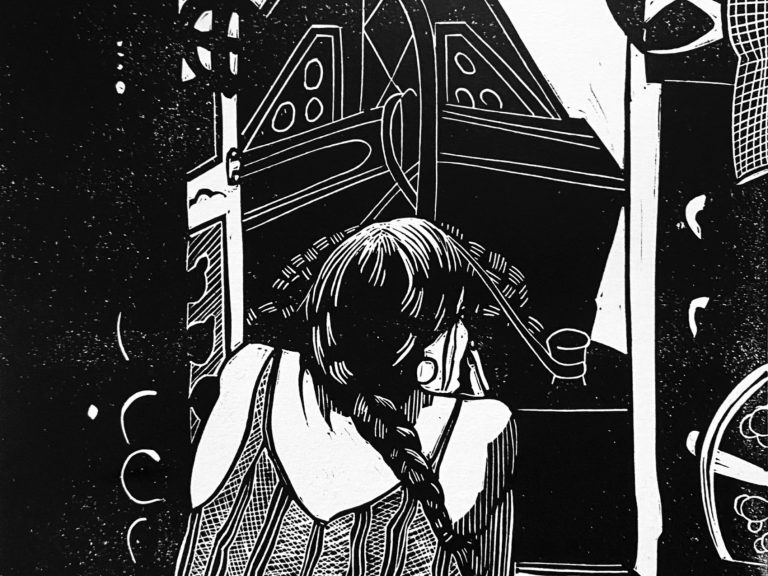 Charlotte's work often uses the rediction method of linocut to include many colours in her prints, as well as enjoying the contrast of simple but striking monochrome.